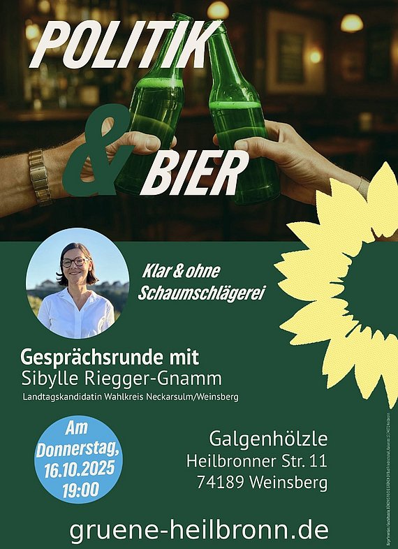 Im historischen Rickele-Zimmer des Galgenhölzle in Weinsberg fand kürzlich ein besonderer politischer Abend statt: Unter dem Motto "Politik und Bier" lud die Landtagskandidatin Sibylle Riegger-Gnamm von Bündnis 90/Die Grünen zum Informations- und Diskussionsabend ein. In gemütlicher Atmosphäre mit Sofa und antiken Möbeln kamen zahlreiche Interessierte zusammen, darunter viele Mitglieder des Ortsvereins Weinsberger Tal. Als besonderer Gast war Landtagsabgeordneter Armin Waldbüßer dabei, der direkt von Sitzungen in Stuttgart anreiste.