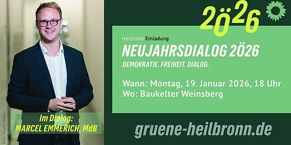 Der bündnisgrüne Kreisverband Heilbronn lädt herzlich ein, gemeinsam mit unserem Gast, dem Bundestagsabgeordneten Marcel Emmerich, sowie unseren Kandidierenden für den Landtag, Gudula Achterberg, MdL, Erwin Köhler, MdL und Sibylle Riegger-Gnamm zu diskutieren, wie wir Demokratie, Freiheit und Vielfalt stärken können.